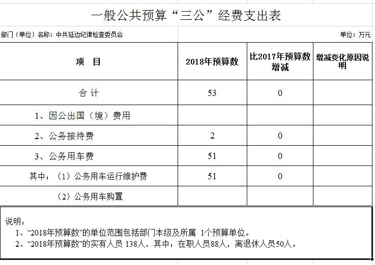 2018年“三公”经费预算数为53万元,比2017年预算数减少0万元。其中: